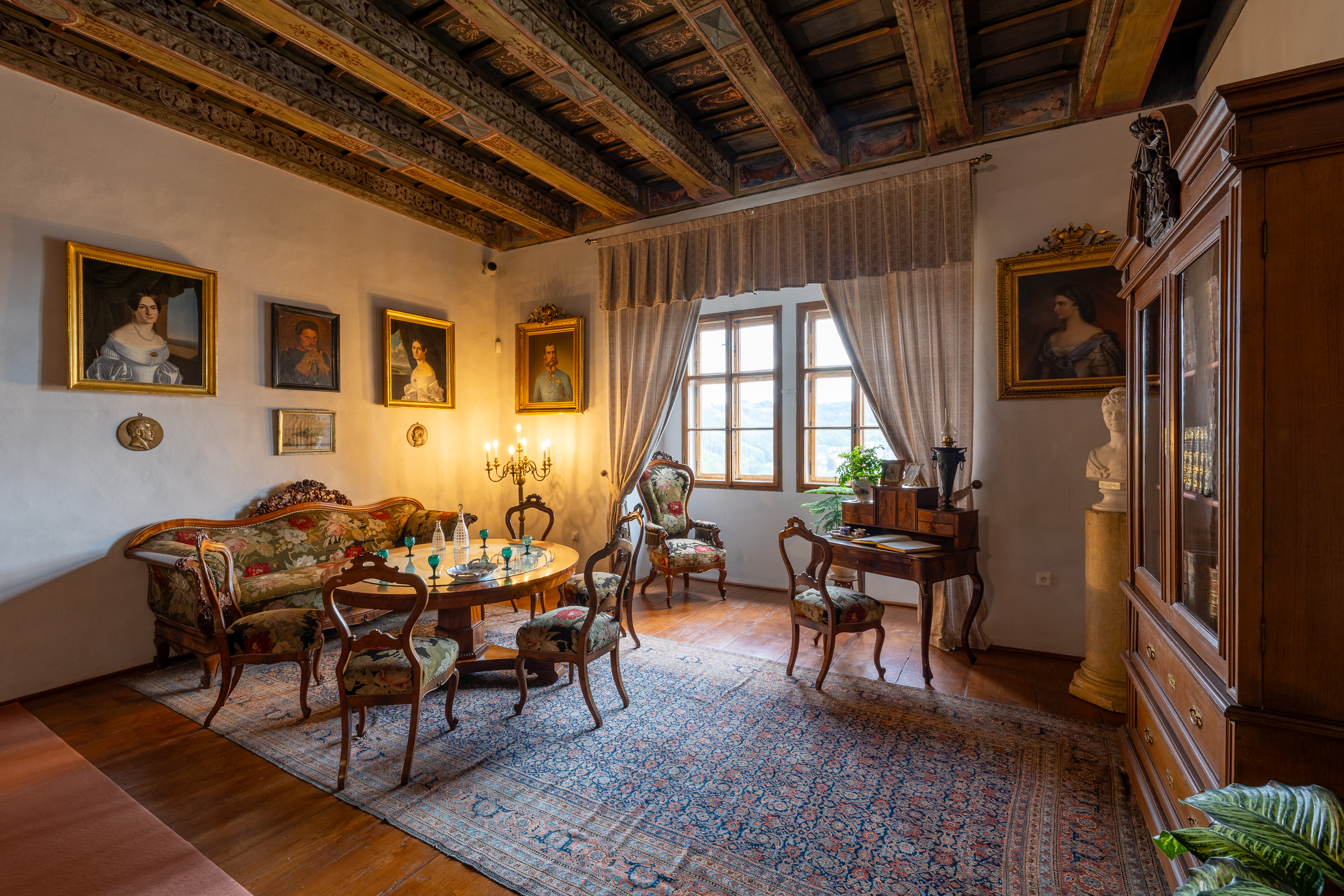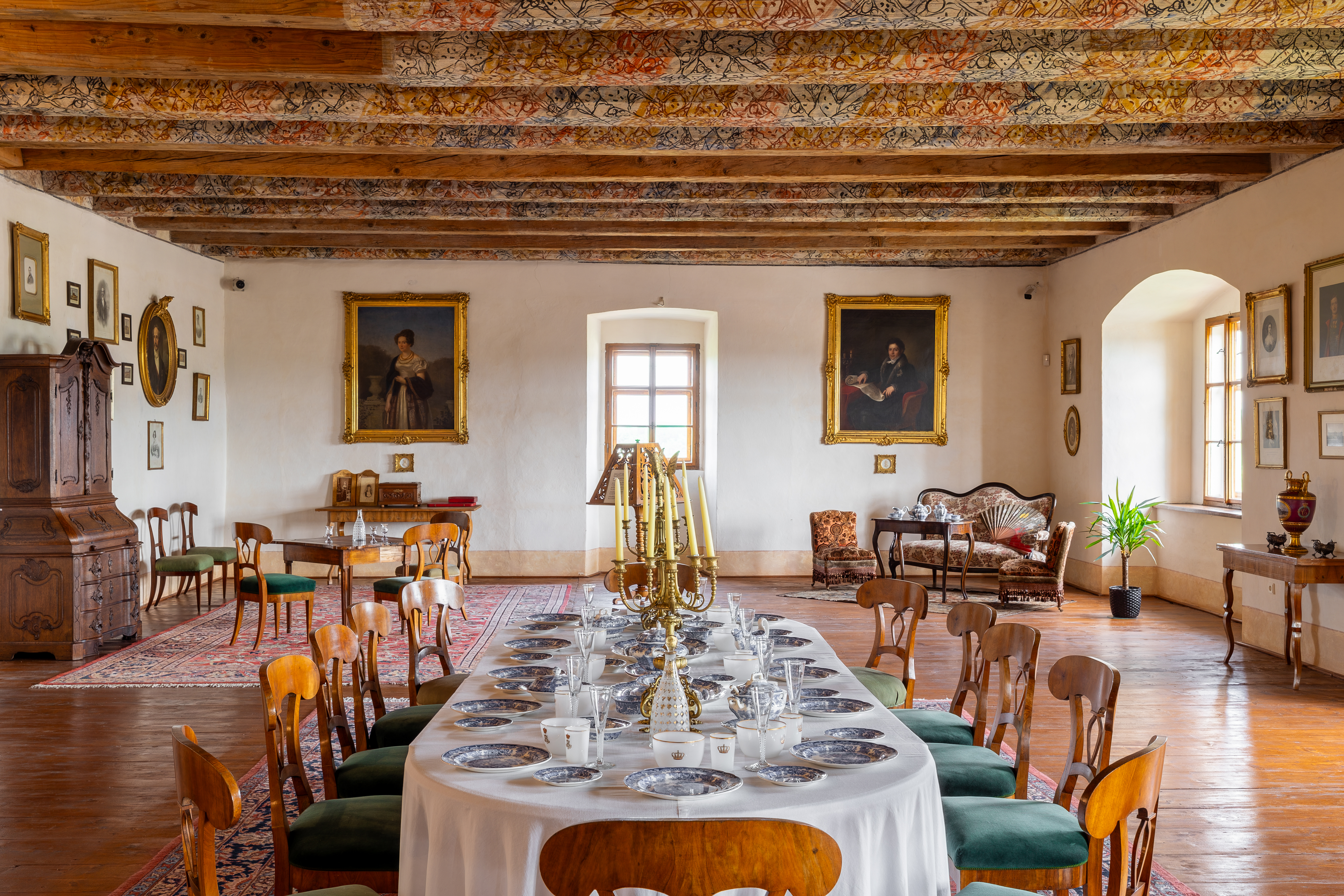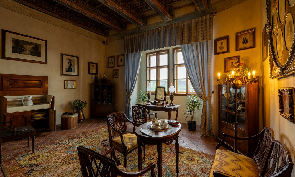 Wnętrza przypominają XIX wiek i unikalne malowane stropy belkowe z połowy XVII i XVIII wieku.