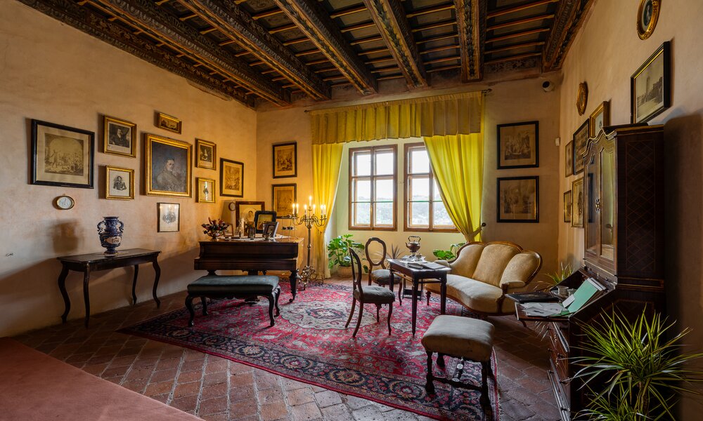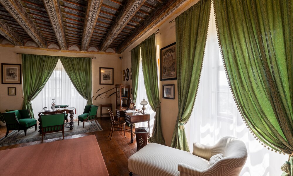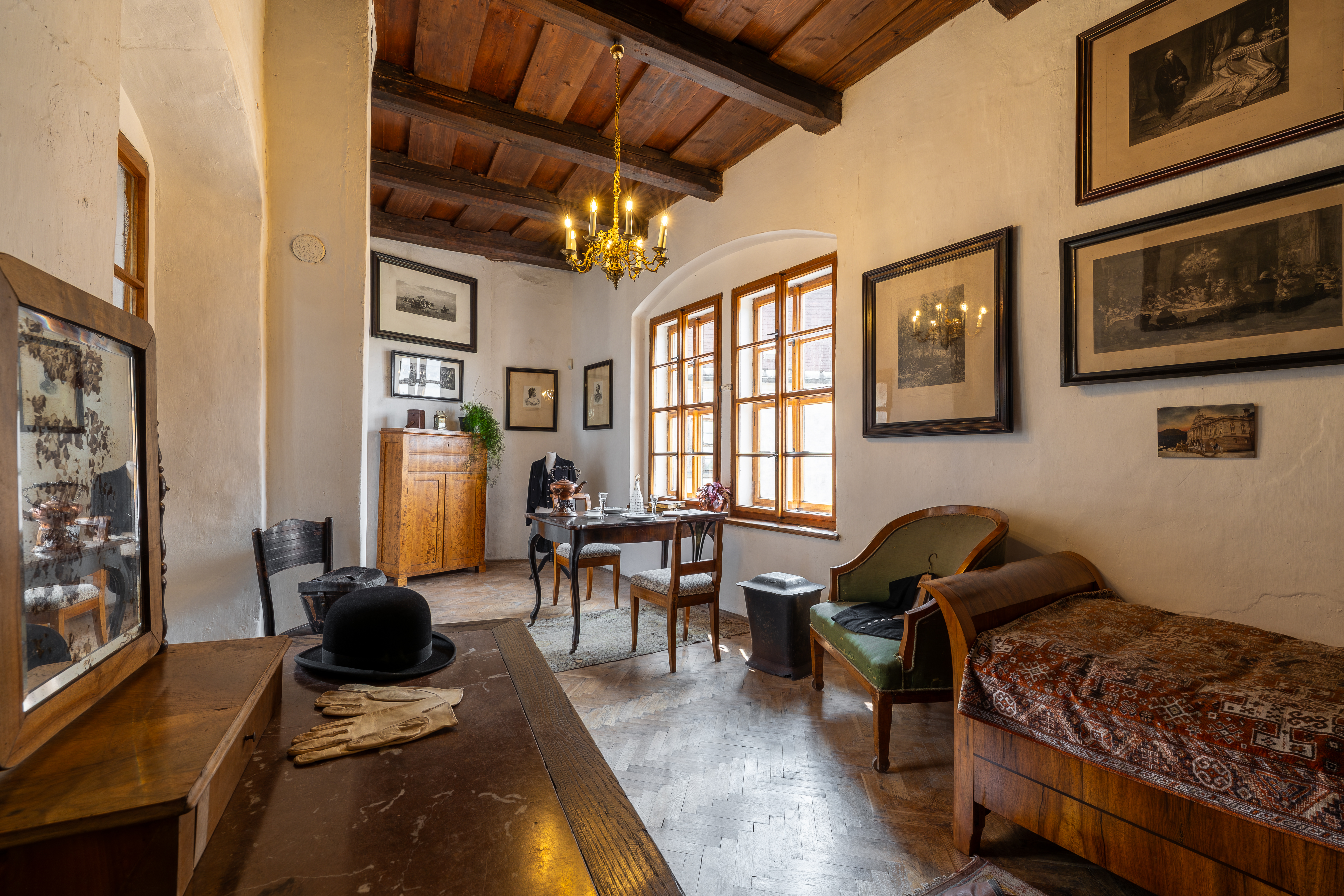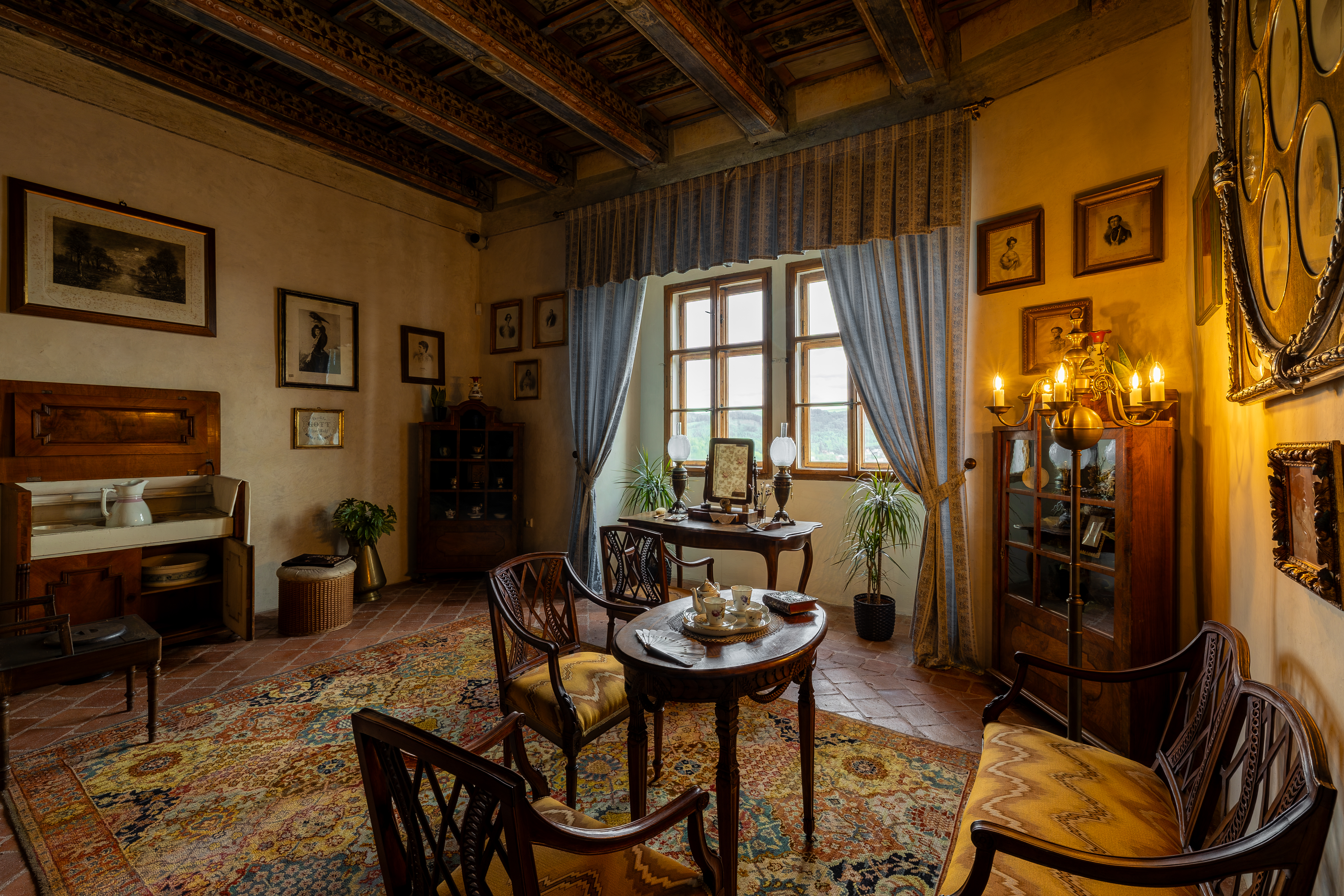 Wnętrza przypominają XIX wiek i unikalne malowane stropy belkowe z połowy XVII i XVIII wieku.