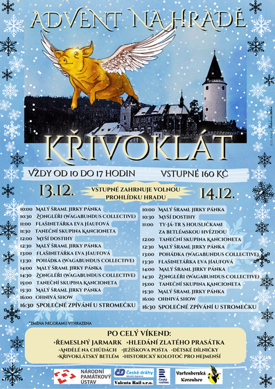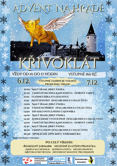 Budeme moc rádi, když si kouzelný předvánoční čas přijedete na Křivoklát užít společně s námi. Dát si něco dobrého, poklábosit u svařáku a horké medoviny, zazpívat si, zatančit nebo se pokusit najít zlaté prasátko - to abyste o Štědrém dnu nemuseli až do večera hladovět.